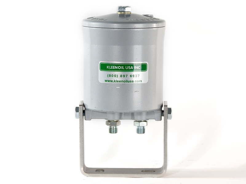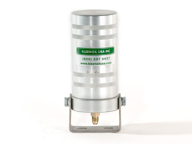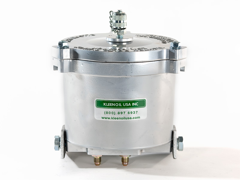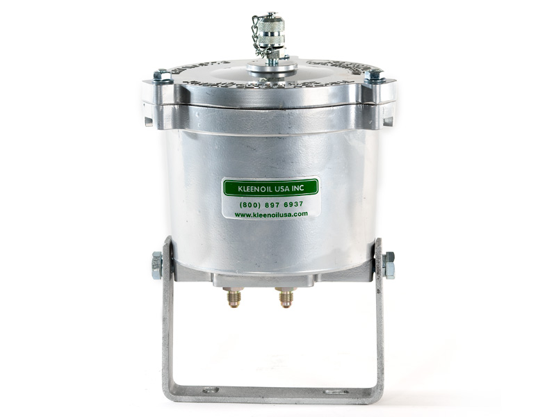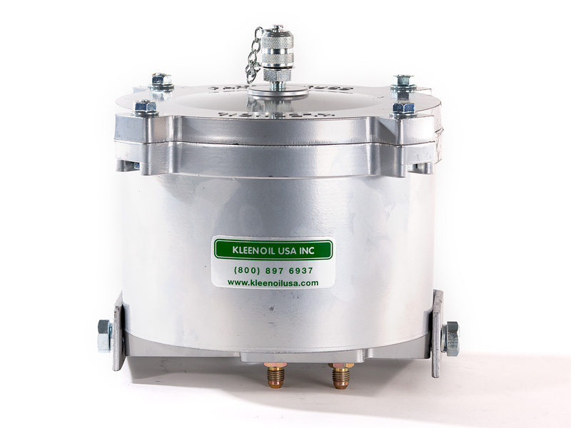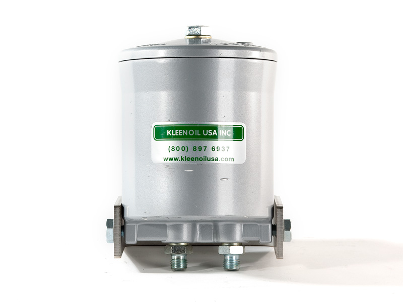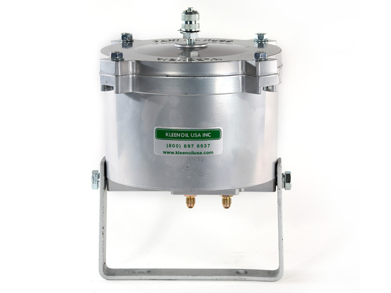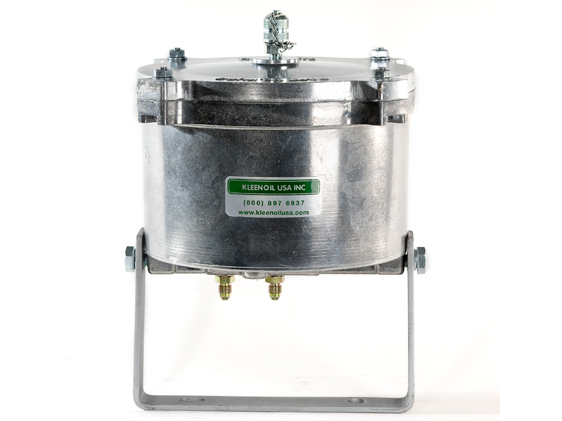 The Kleenoil USA filtration unit is made of cast aluminum with a galvanized steel mounting bracket. There are five basic sizes, which are installed according to the applications table below. It is connected to the engine lubricating oil circulating system in a bypass loop using high pressure braided hose and fittings to SAE standards.